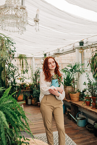 Caption:Charming female with long ginger hair standing with jug of seedling in indoor garden with various potted houseplants at home