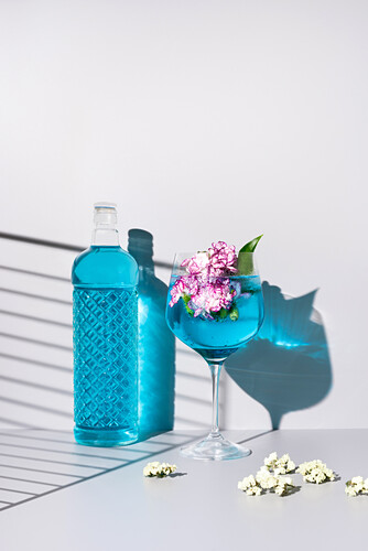 Caption:Glass bottle of blue colored liquid placed near glass with refreshing cocktail with ice and flowers on table against white background