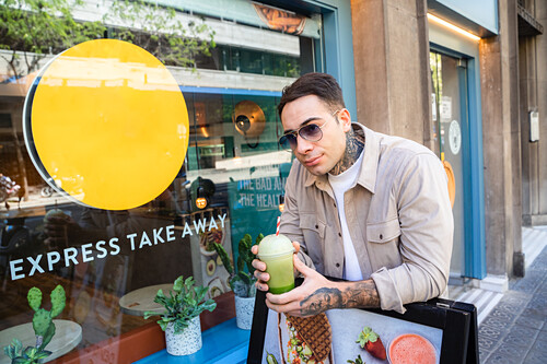 Caption:Cool male in sunglasses with healthy drink to go looking away while leaning on urban signboard with photo of food